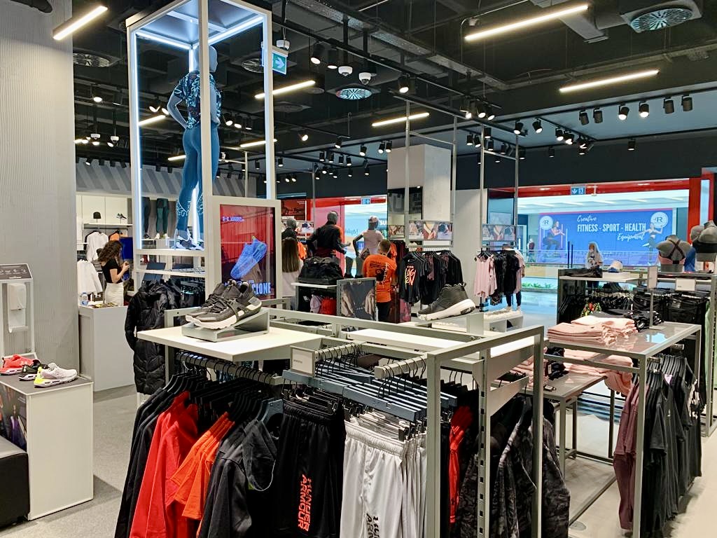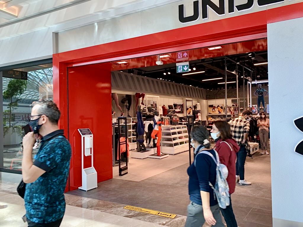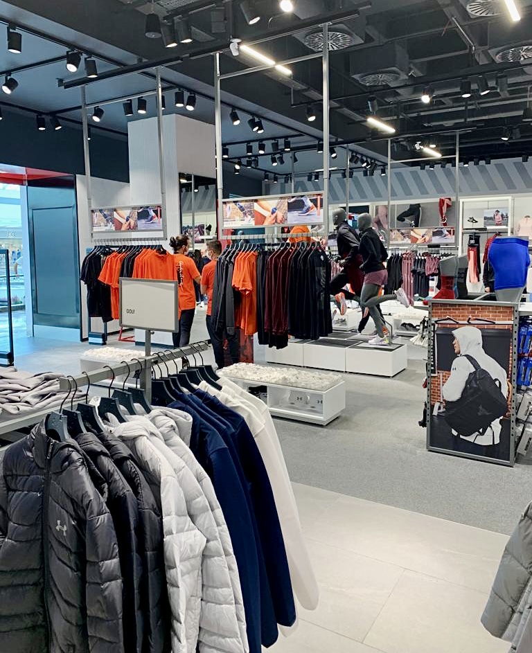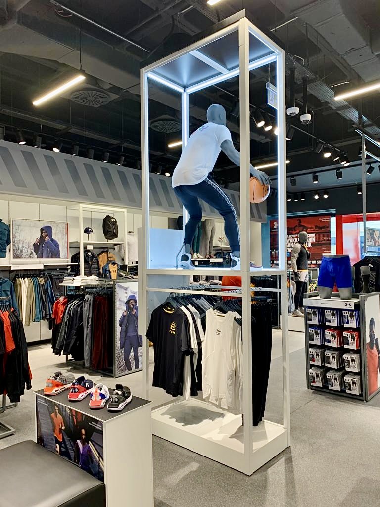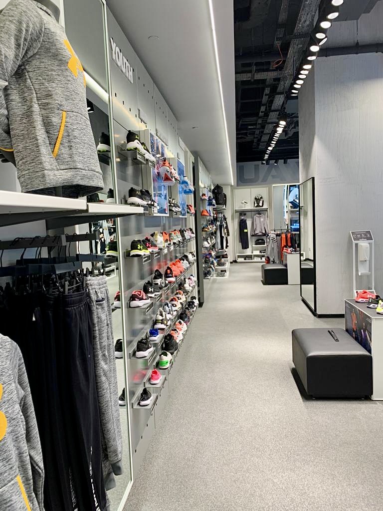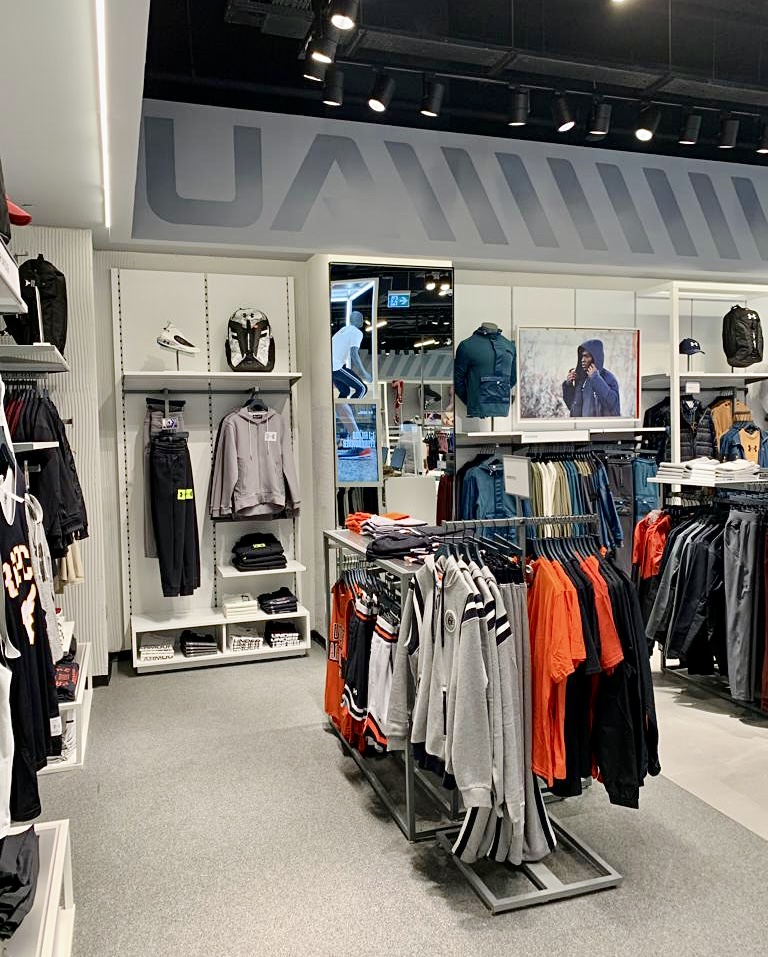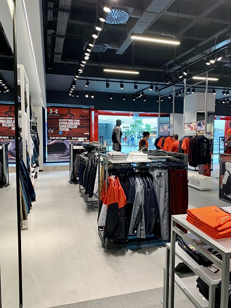İzmir İstinye Park AVM'deki Under Armour mağazası tezgah, raf ve askılıkları.