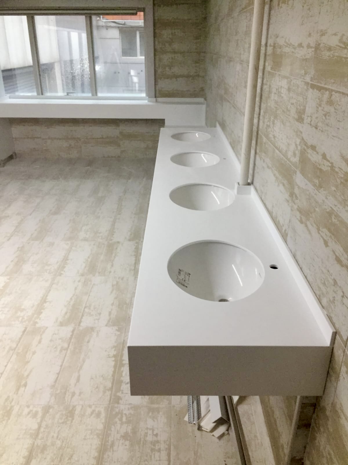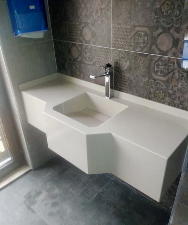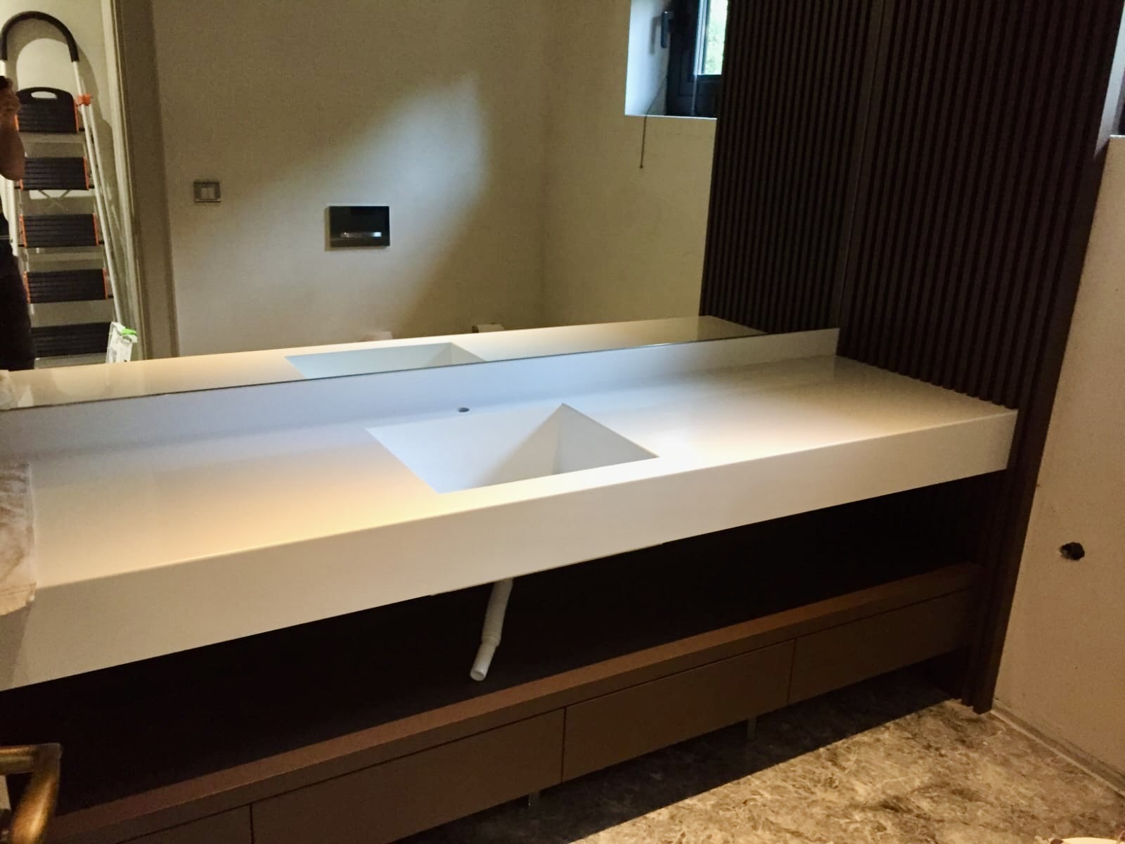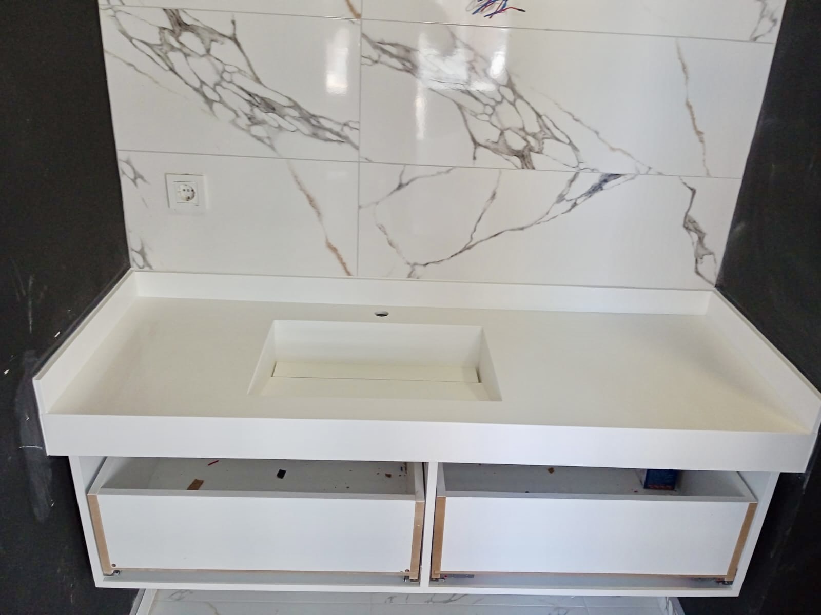 Hem dekoratif hem de anti-bakteriyel bir malzeme olan corian ile ürettiğimiz banyo tasarımlarından bazıları.