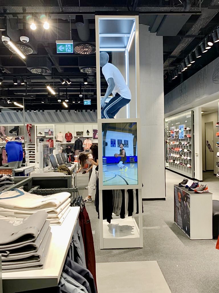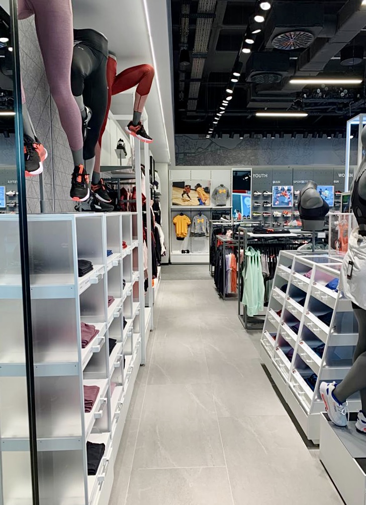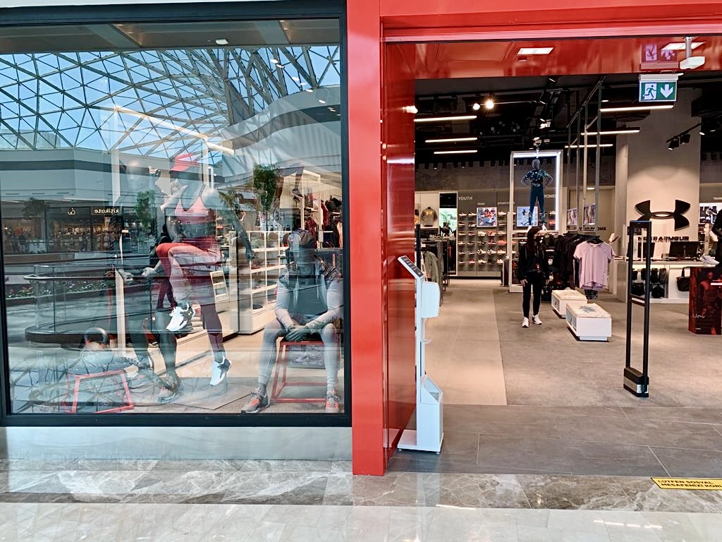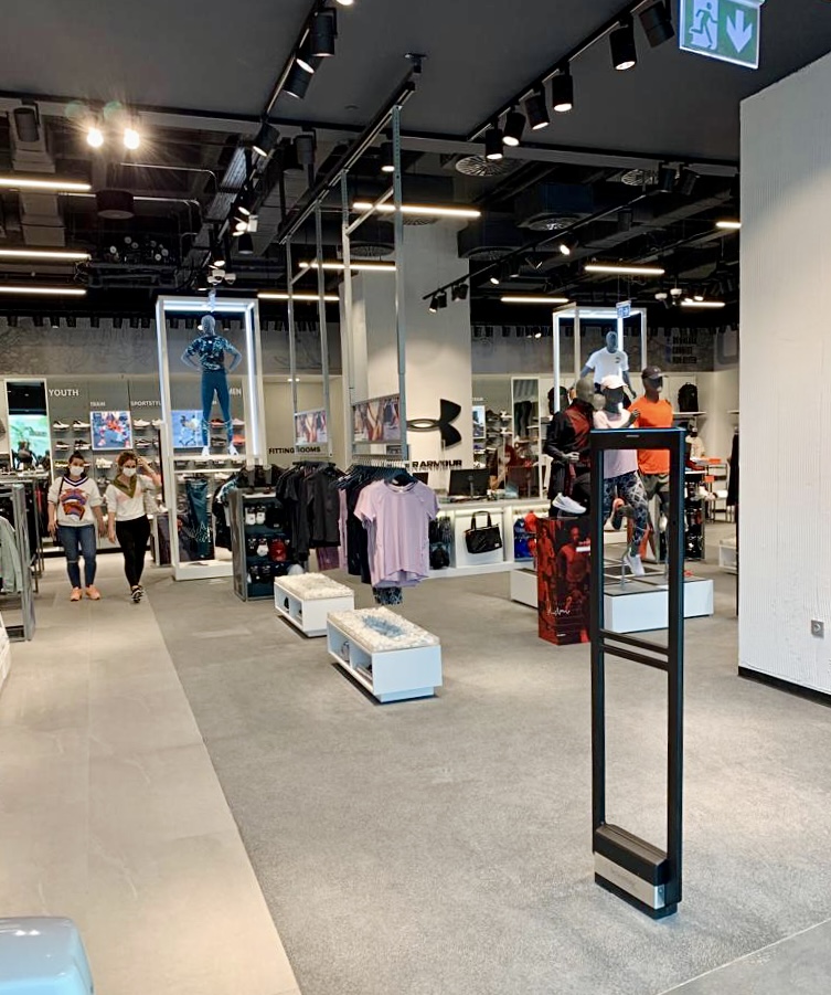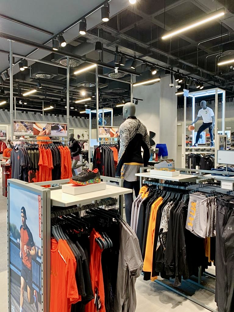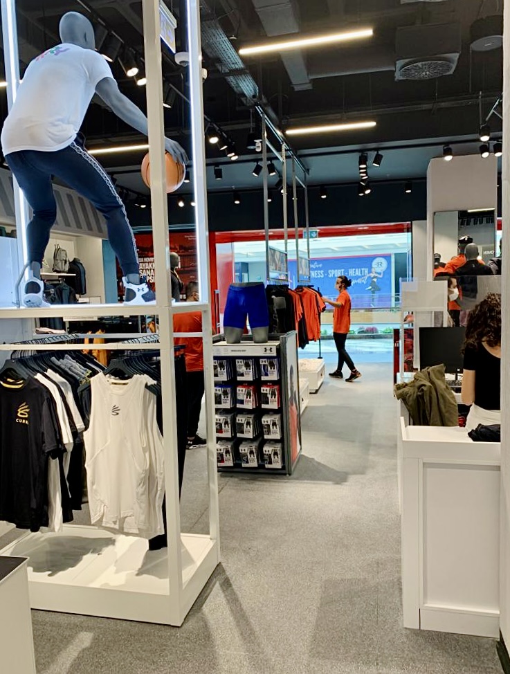 İzmir İstinye Park AVM'deki Under Armour mağazası tezgah, raf ve askılıkları.
